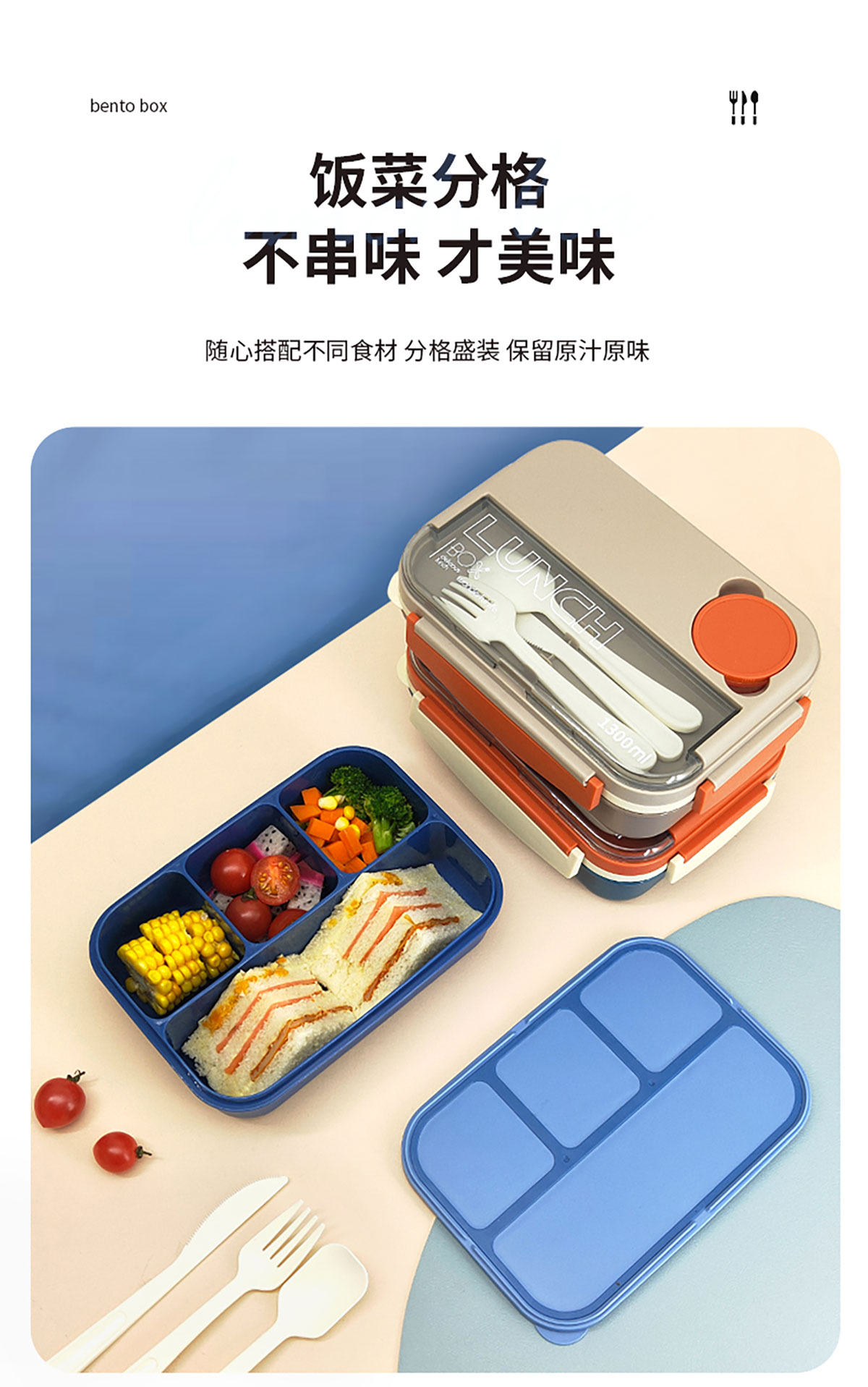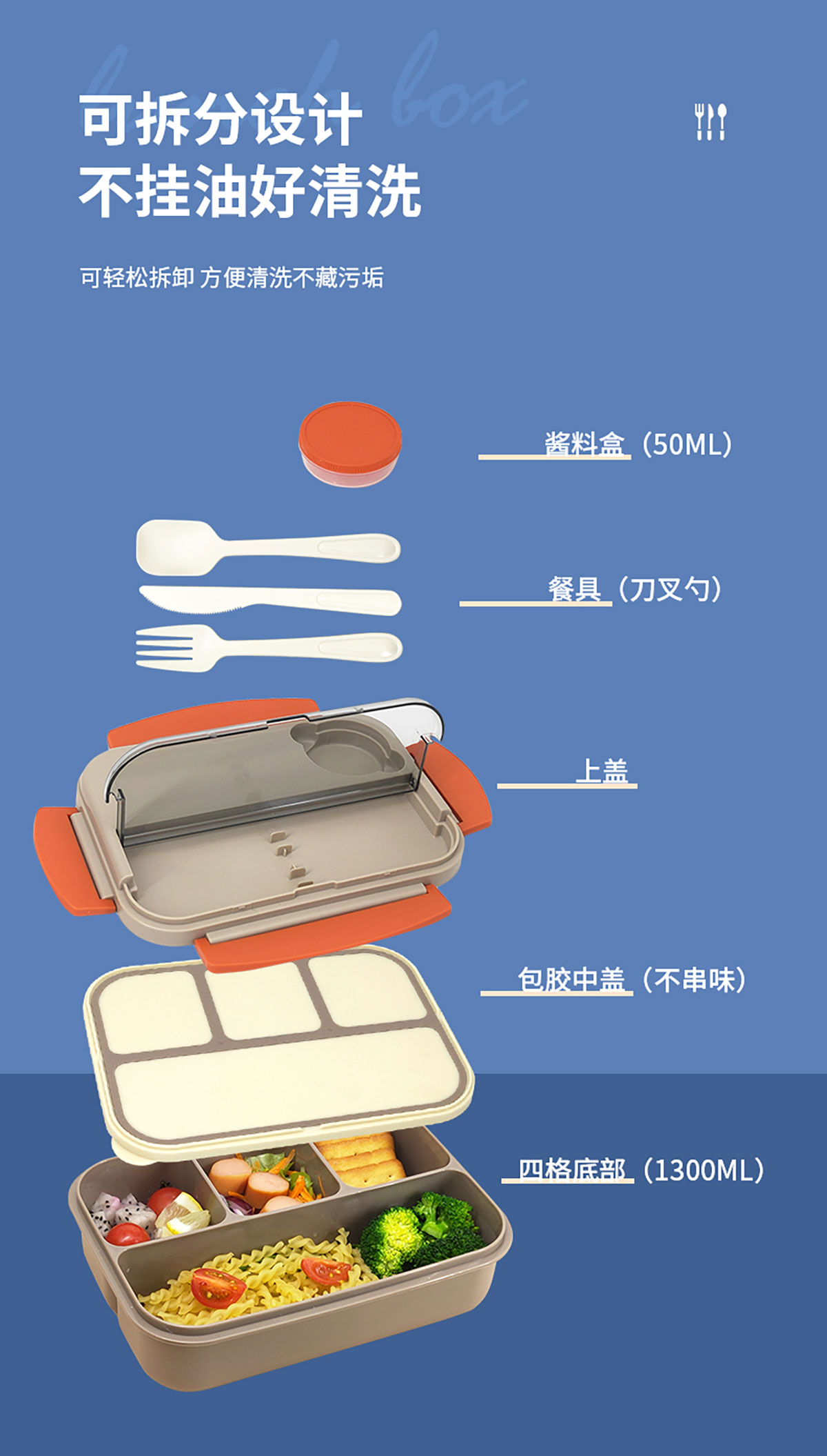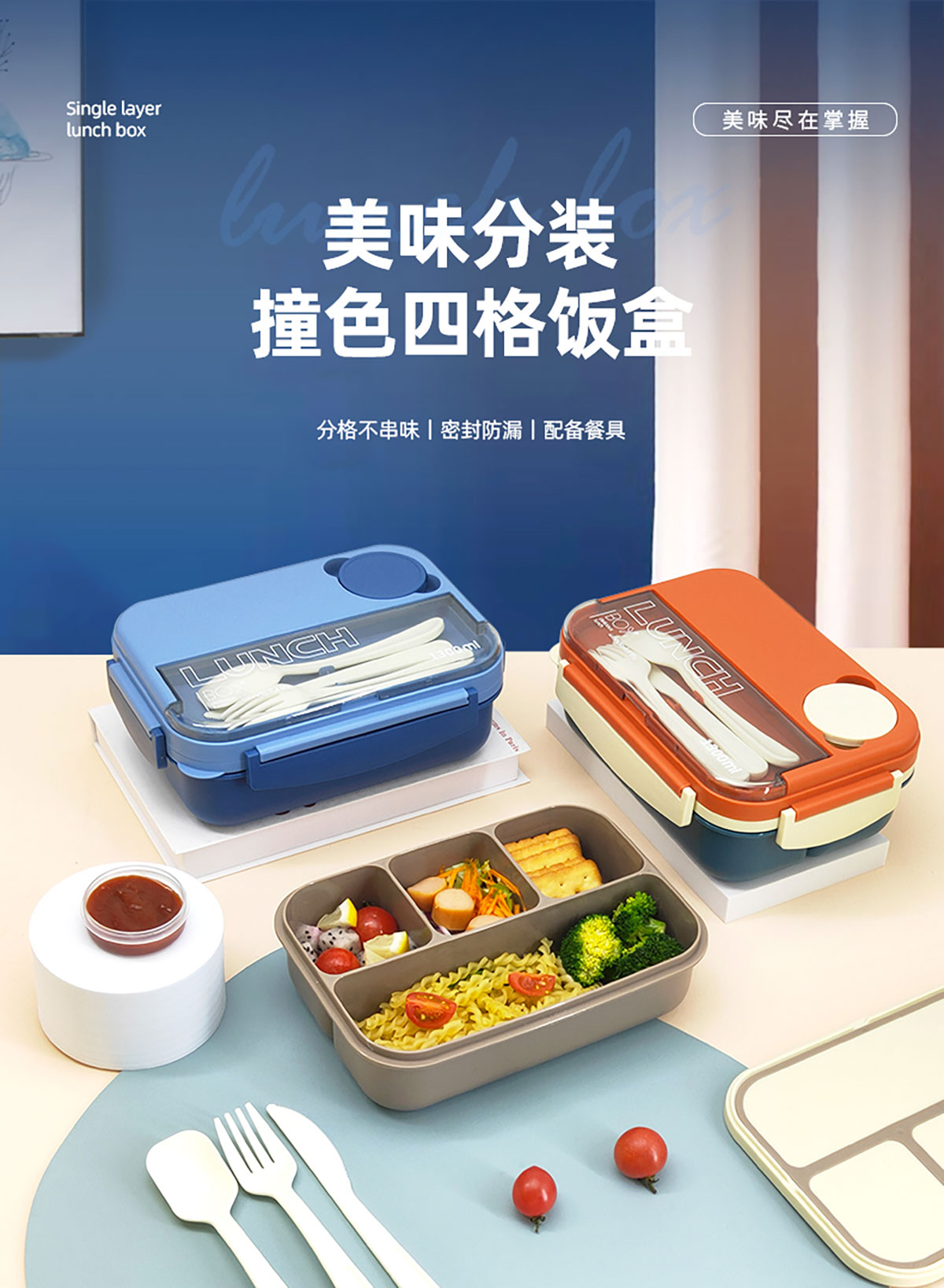 撞色單層四格飯盒1300ml+醬料盒50ml