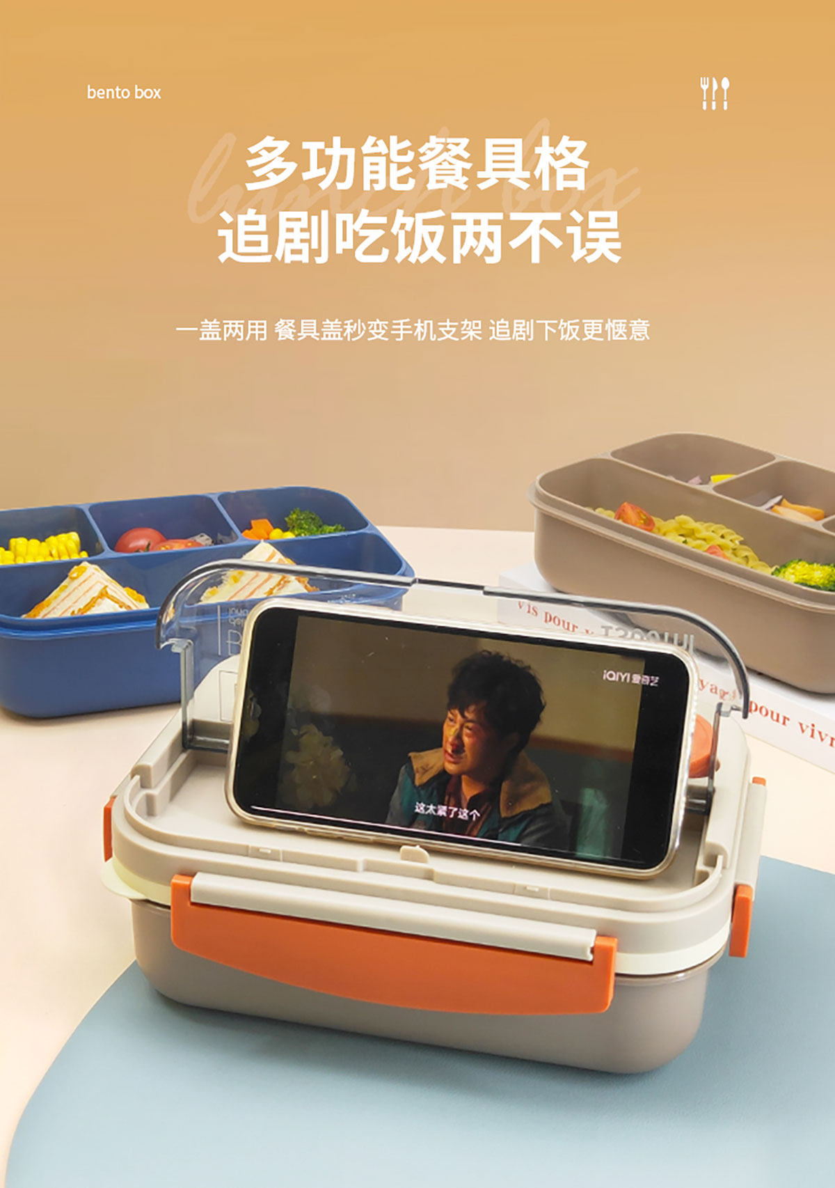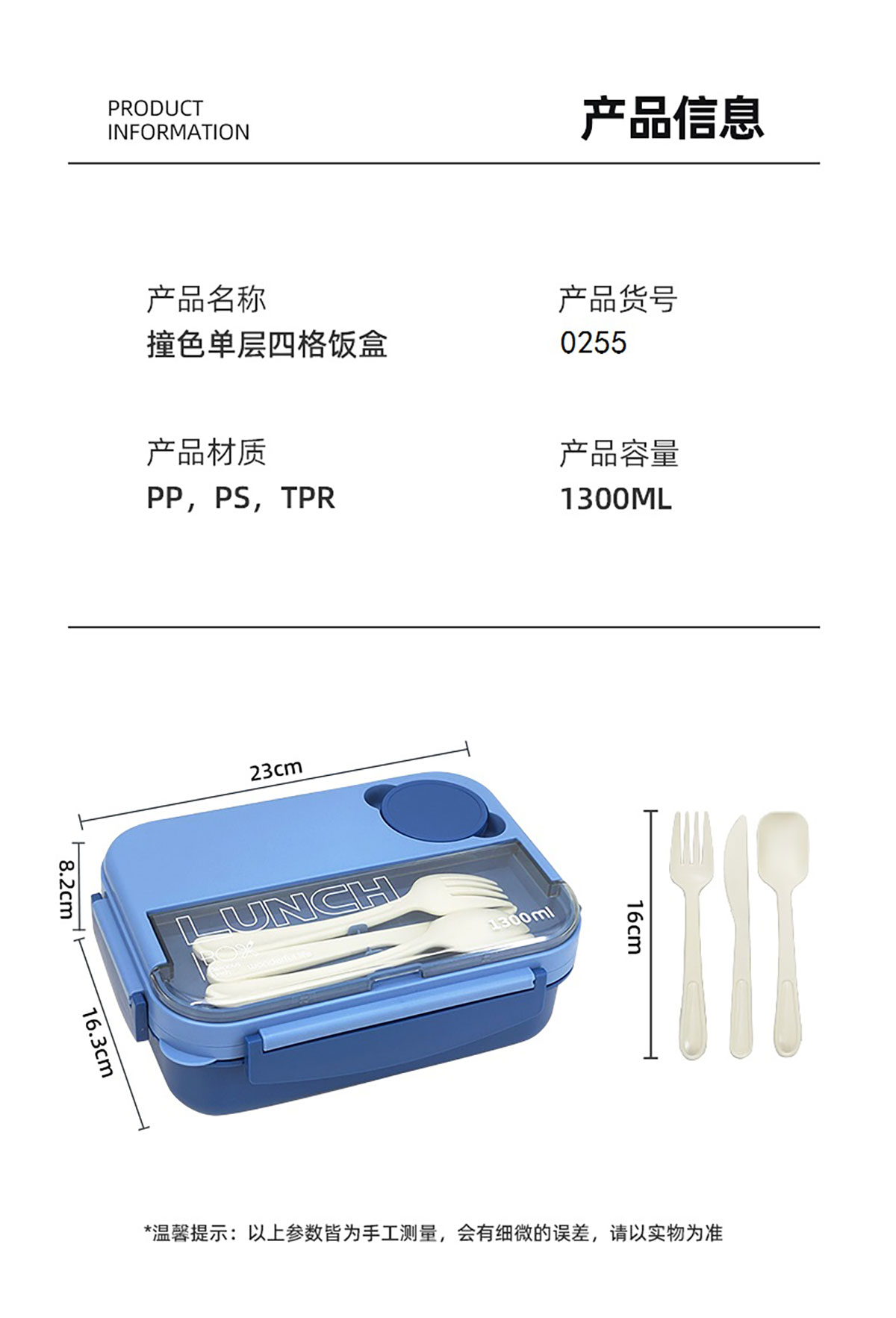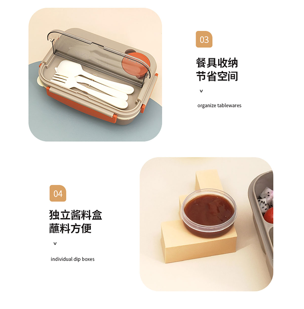撞色單層四格飯盒1300ml+醬料盒50ml