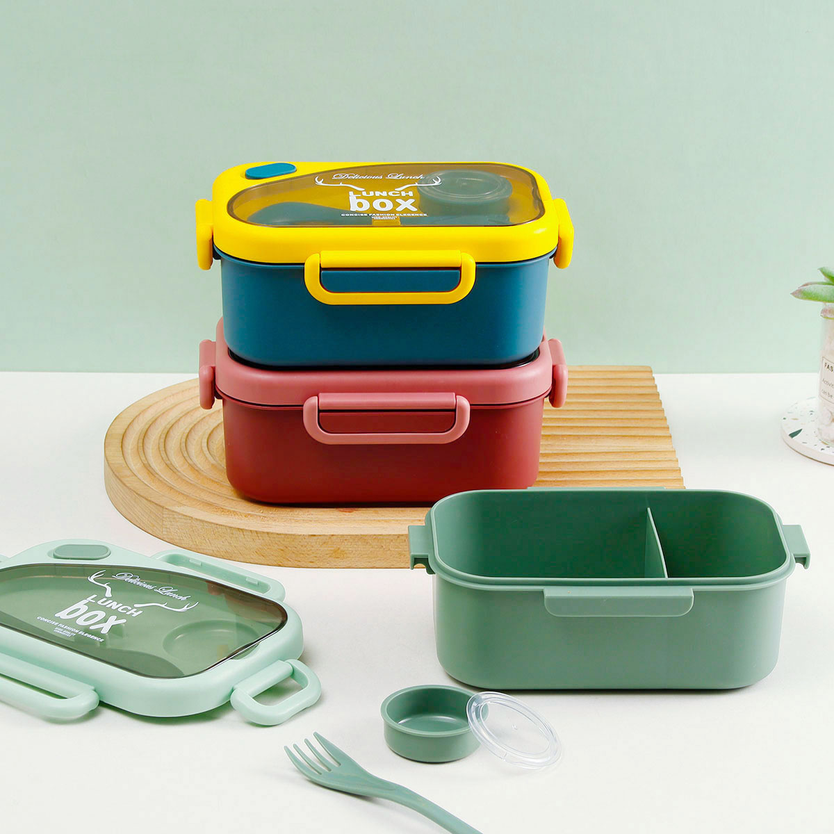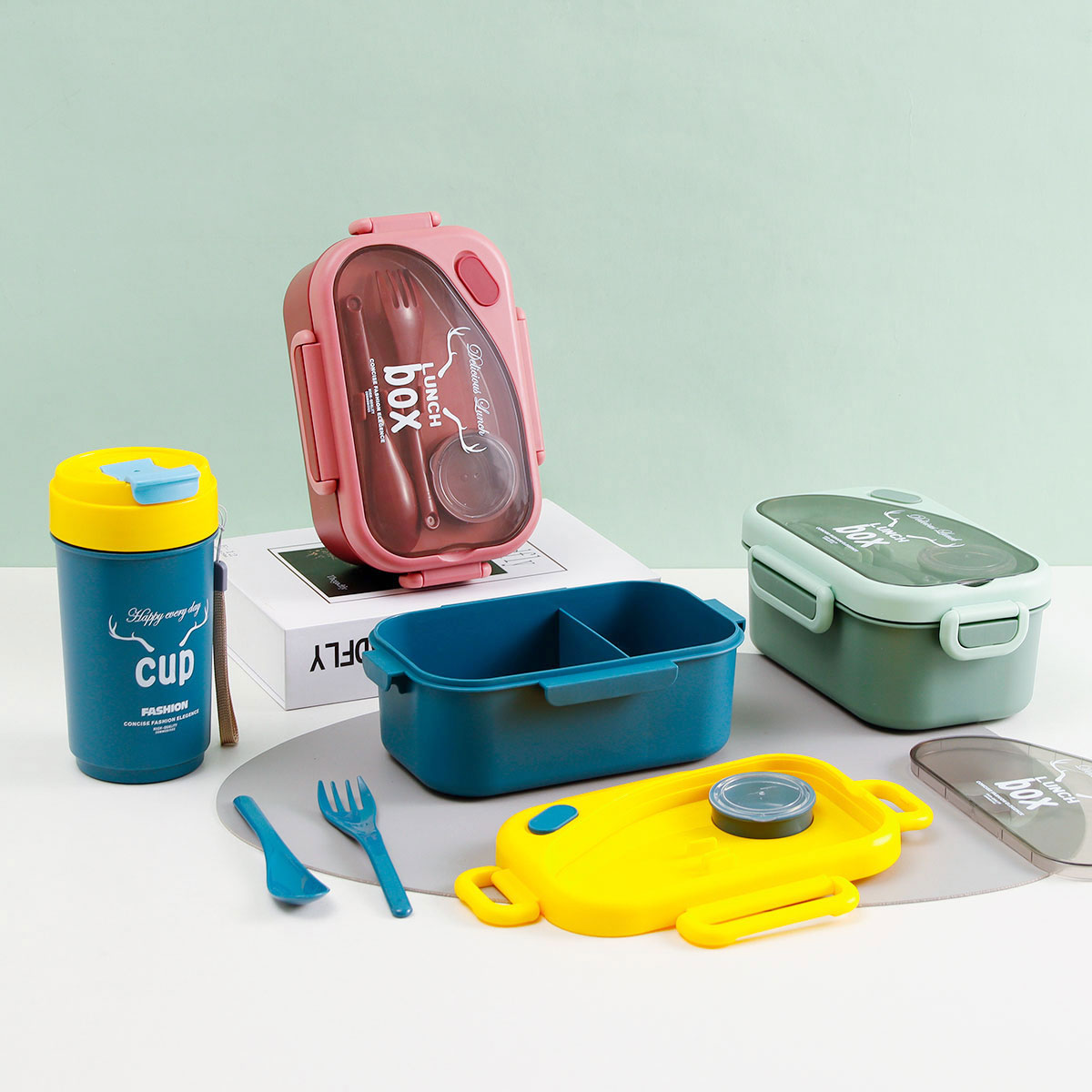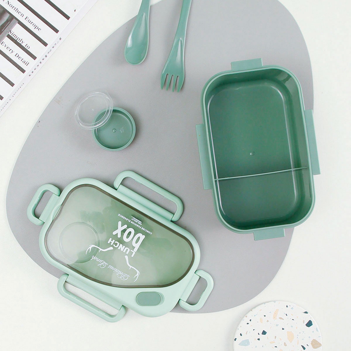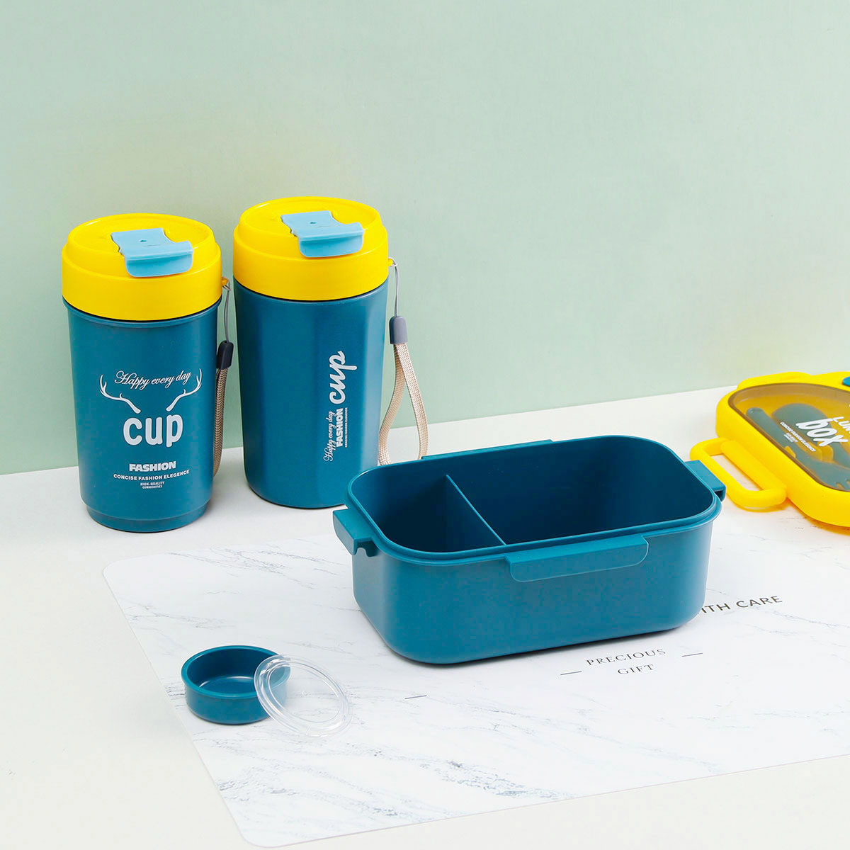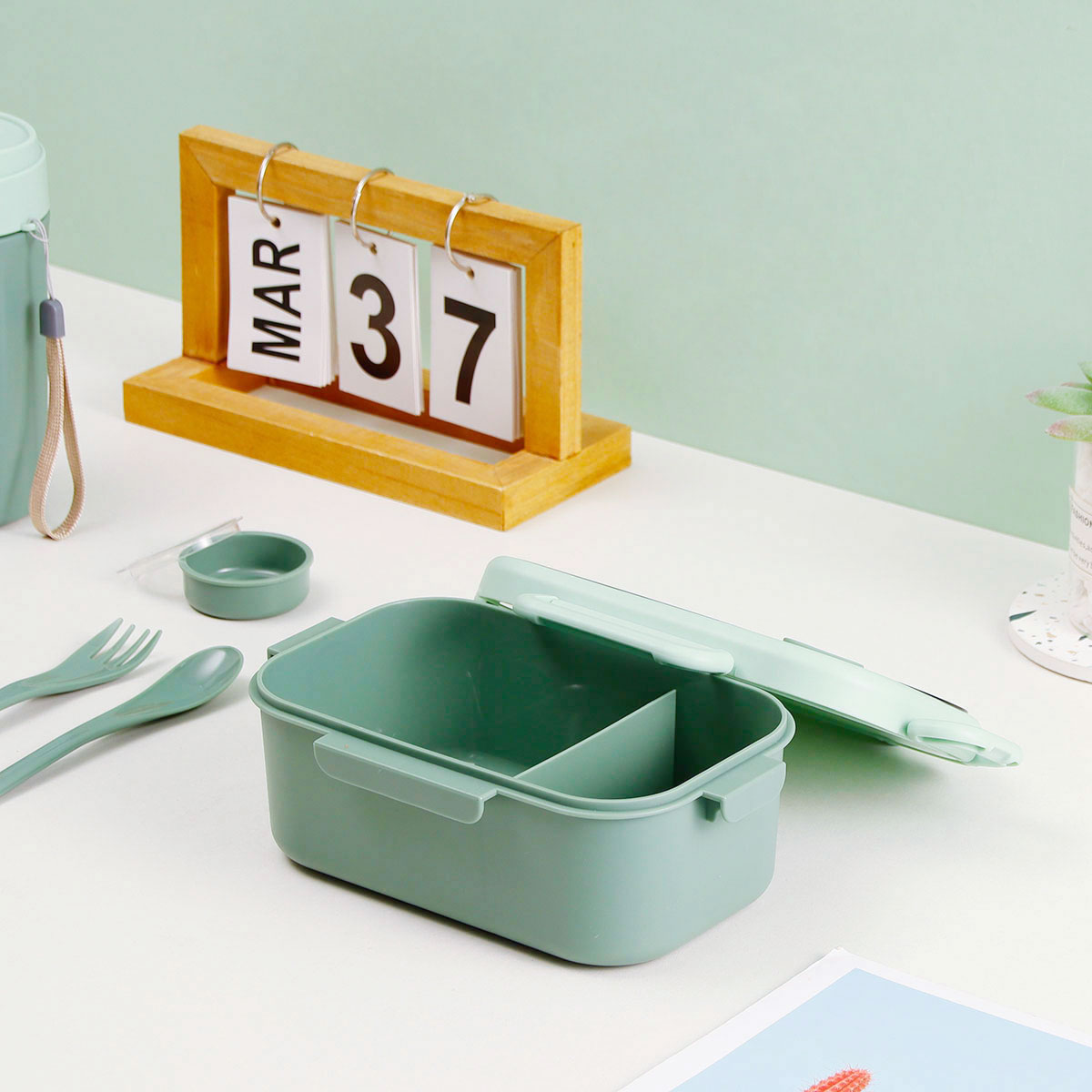 品悅長方單層分格密封飯盒(1000ml)(含醬料盒)+圓形/八角隨行杯(500ml)