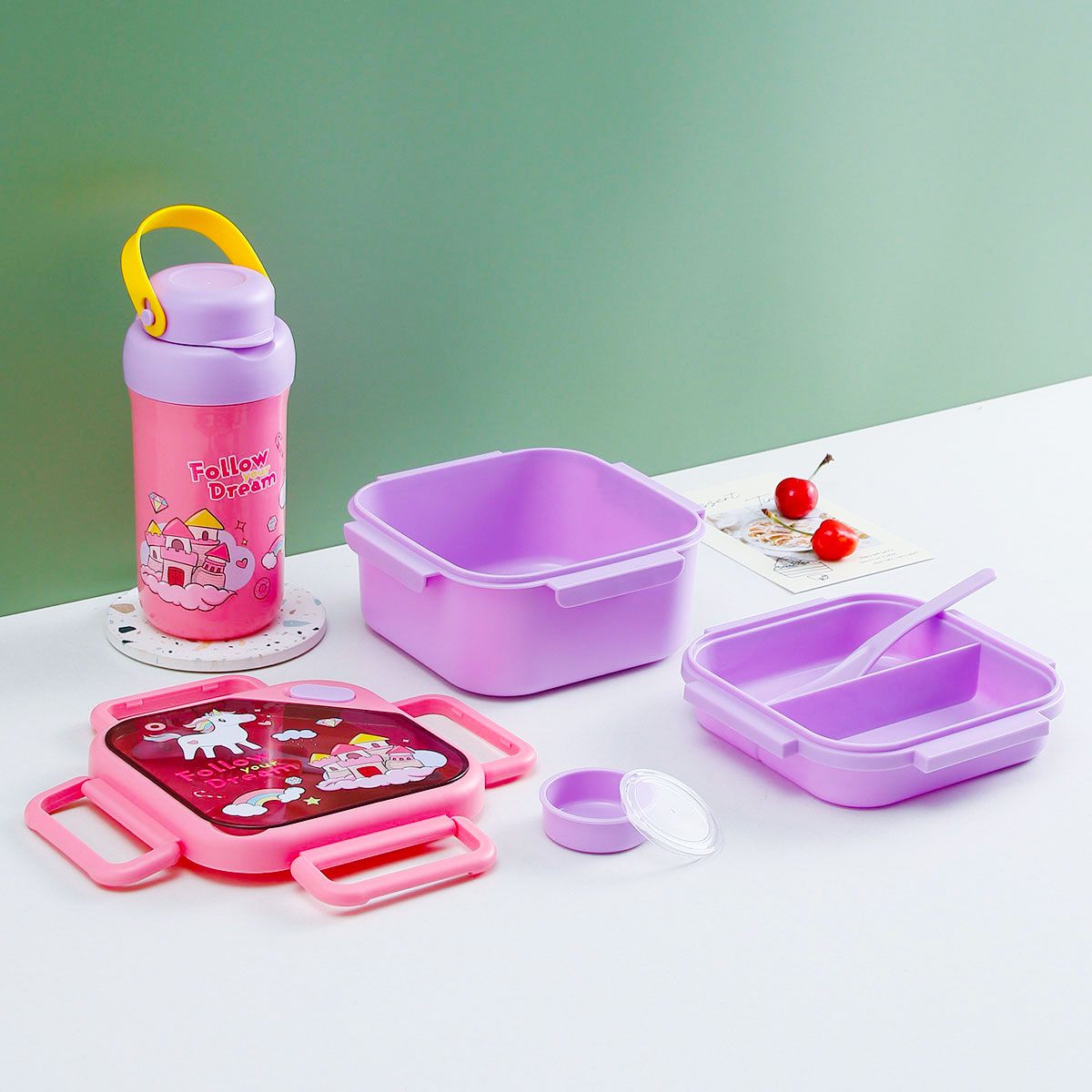趣悅卡通正方雙層飯盒(含調料盒)+翻蓋吸嘴/旋蓋運動/翻蓋運動水壺