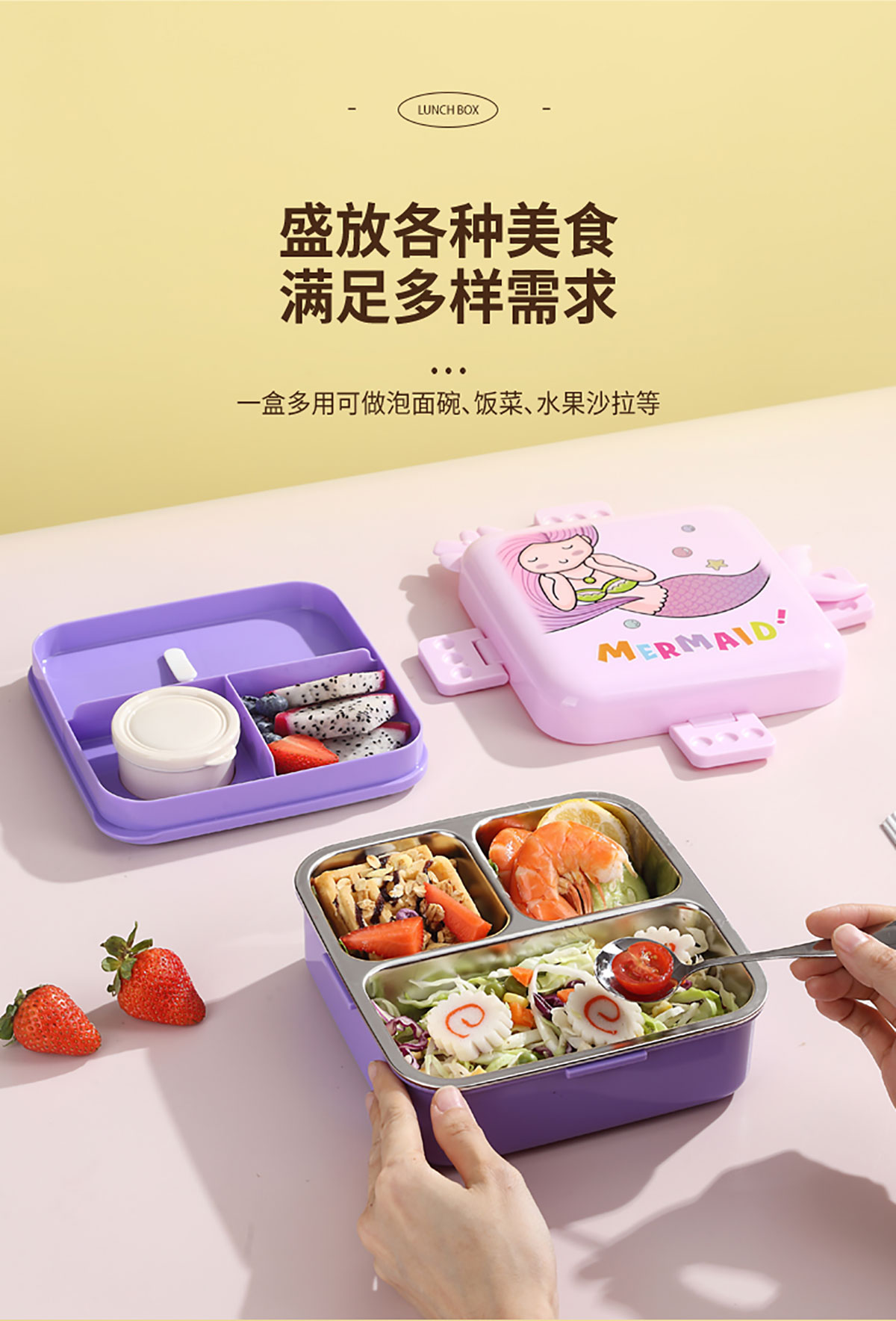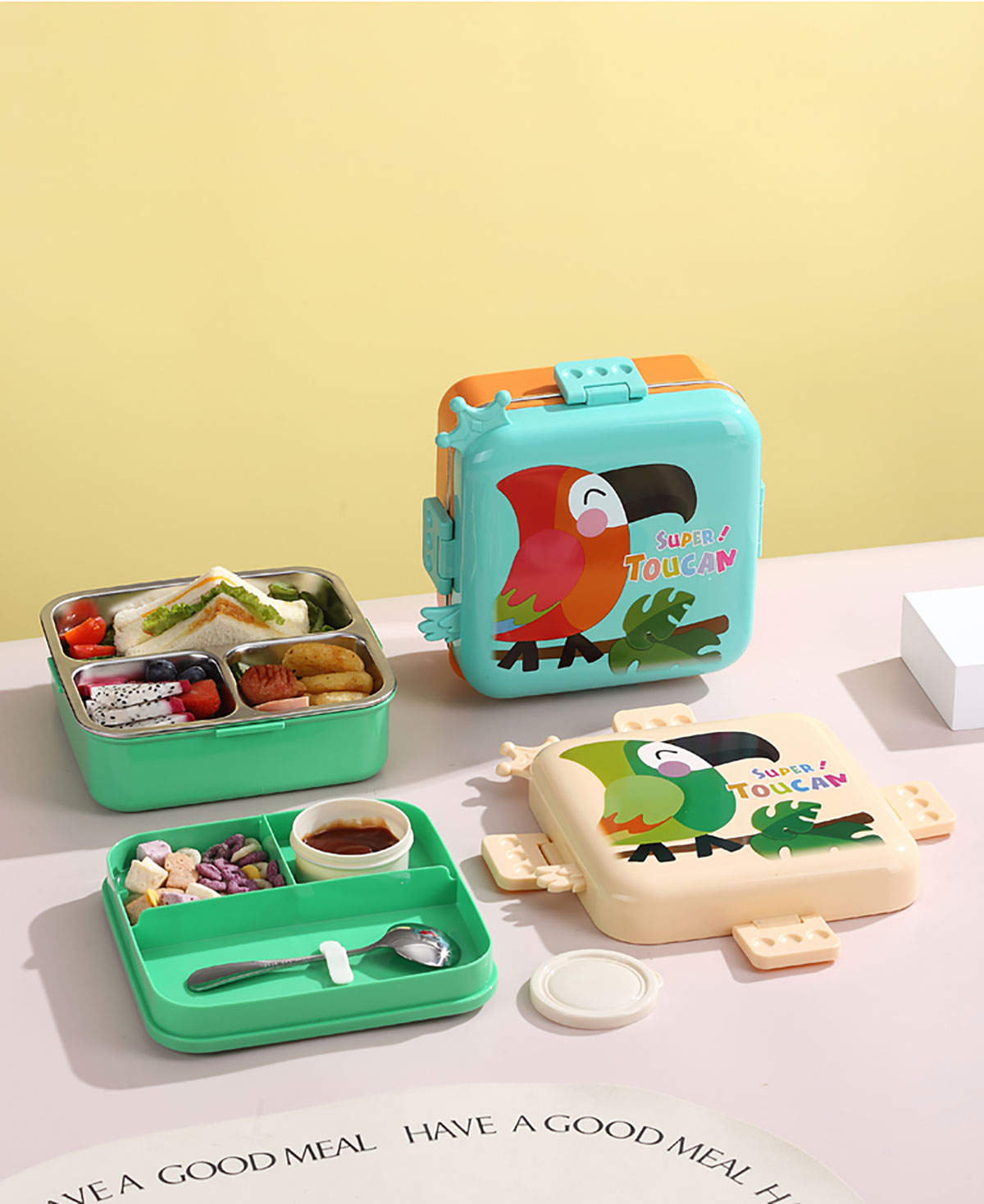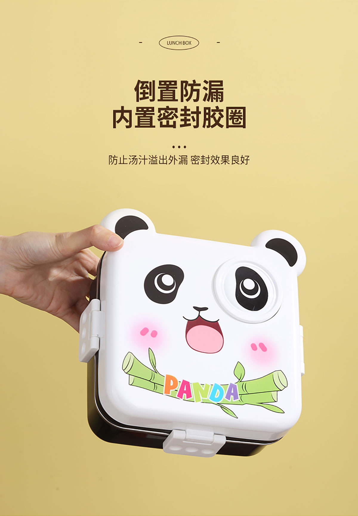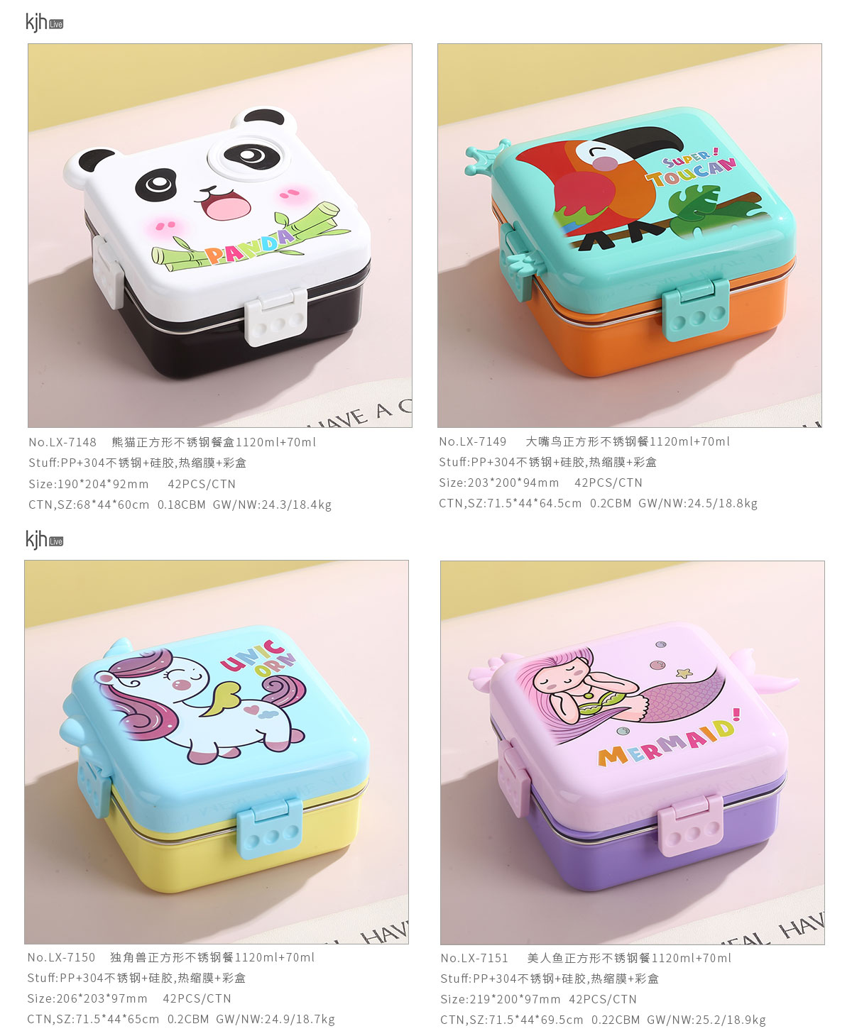 熊貓/大嘴鳥/獨角獸/美人魚正方形不銹鋼餐盒1120ml+70ml