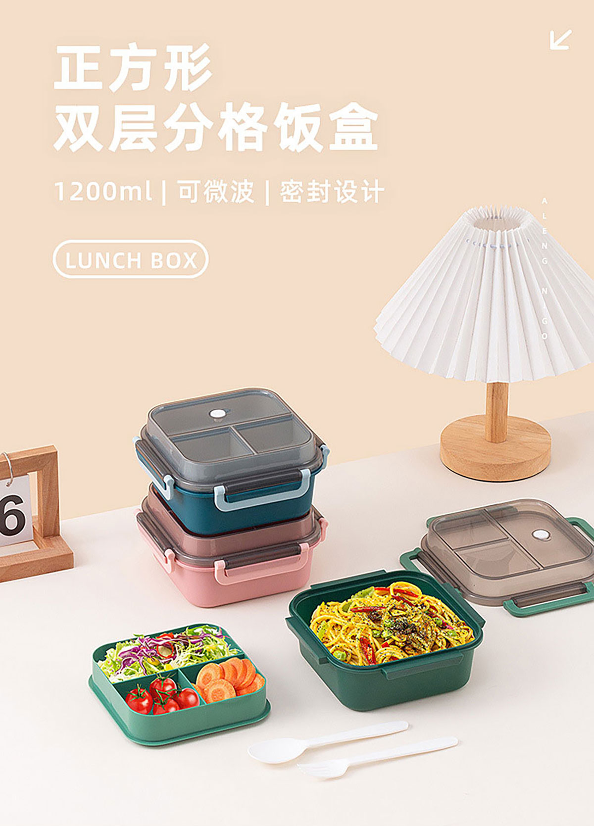 正方雙層分隔飯盒1200ml
