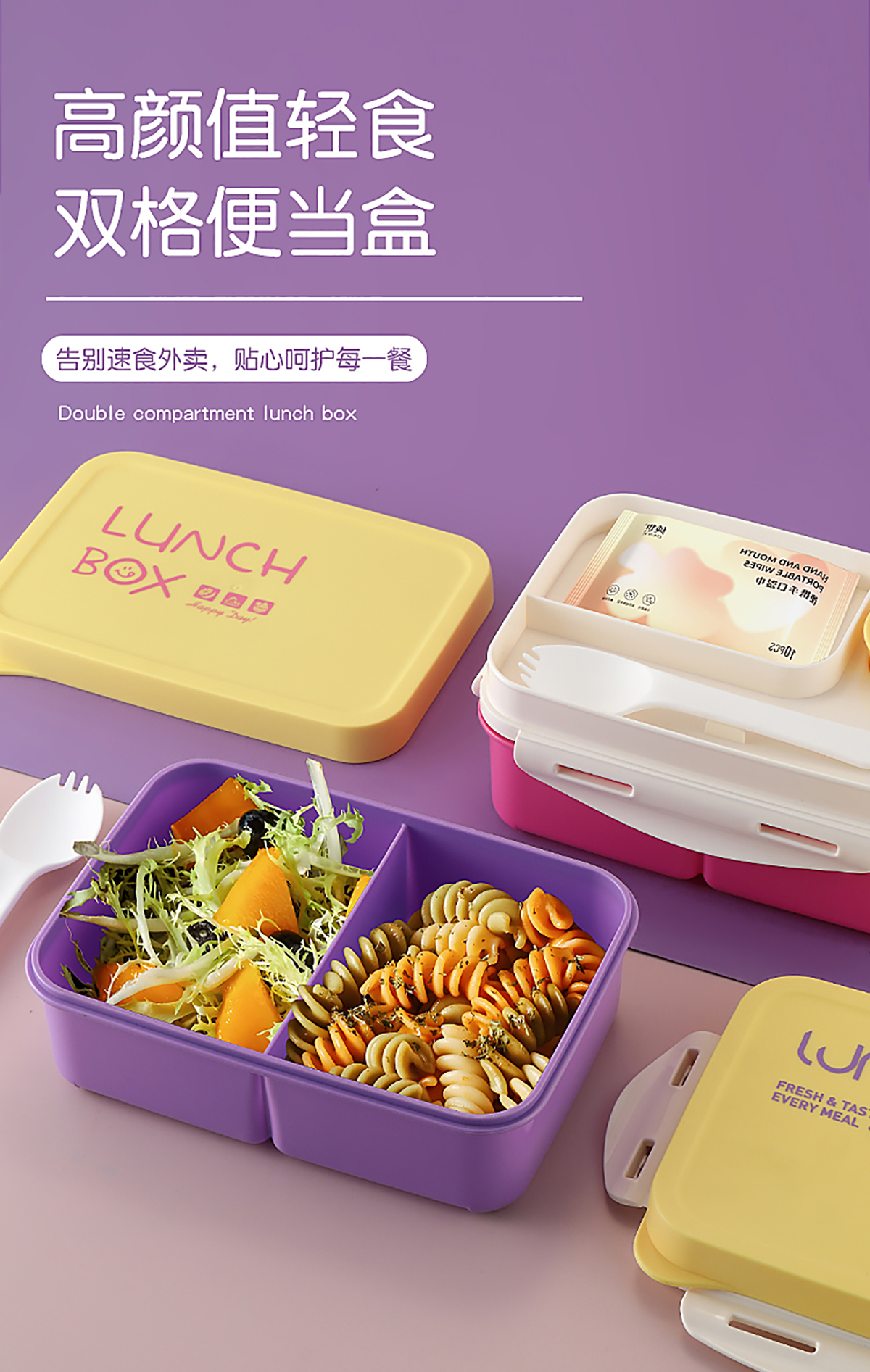 Size: 飯盒:210*150*83mm/1000ml 醬料盒:58*25mm/35ml 叉子:38*42mm