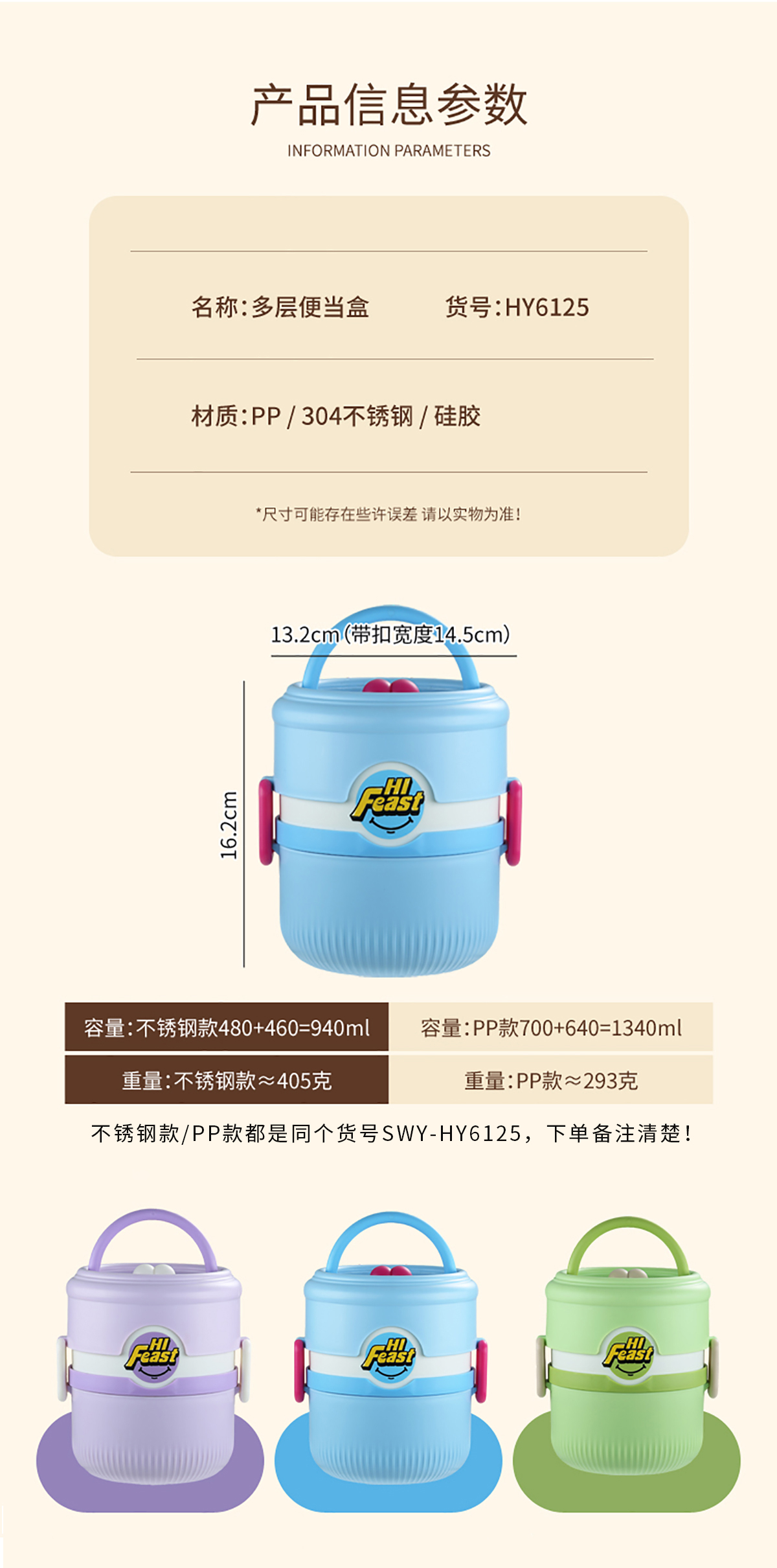 不銹鋼款:直徑132mm(帶扣寬度145mm)*高162mm/480+460=940ml