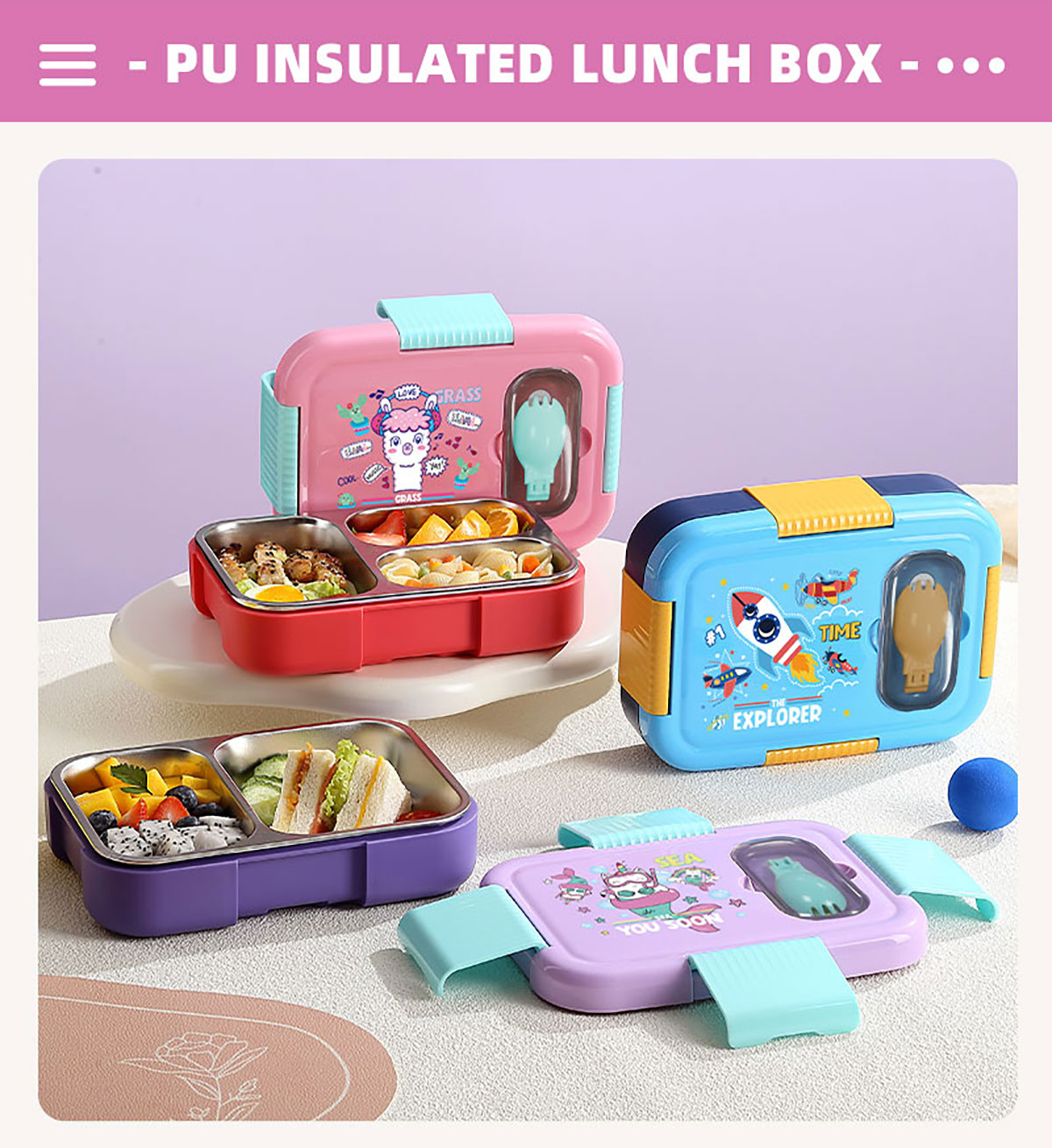 PU全保溫卡通不串味密封餐盒(卡通不銹鋼3格/2格+PP折疊勺)