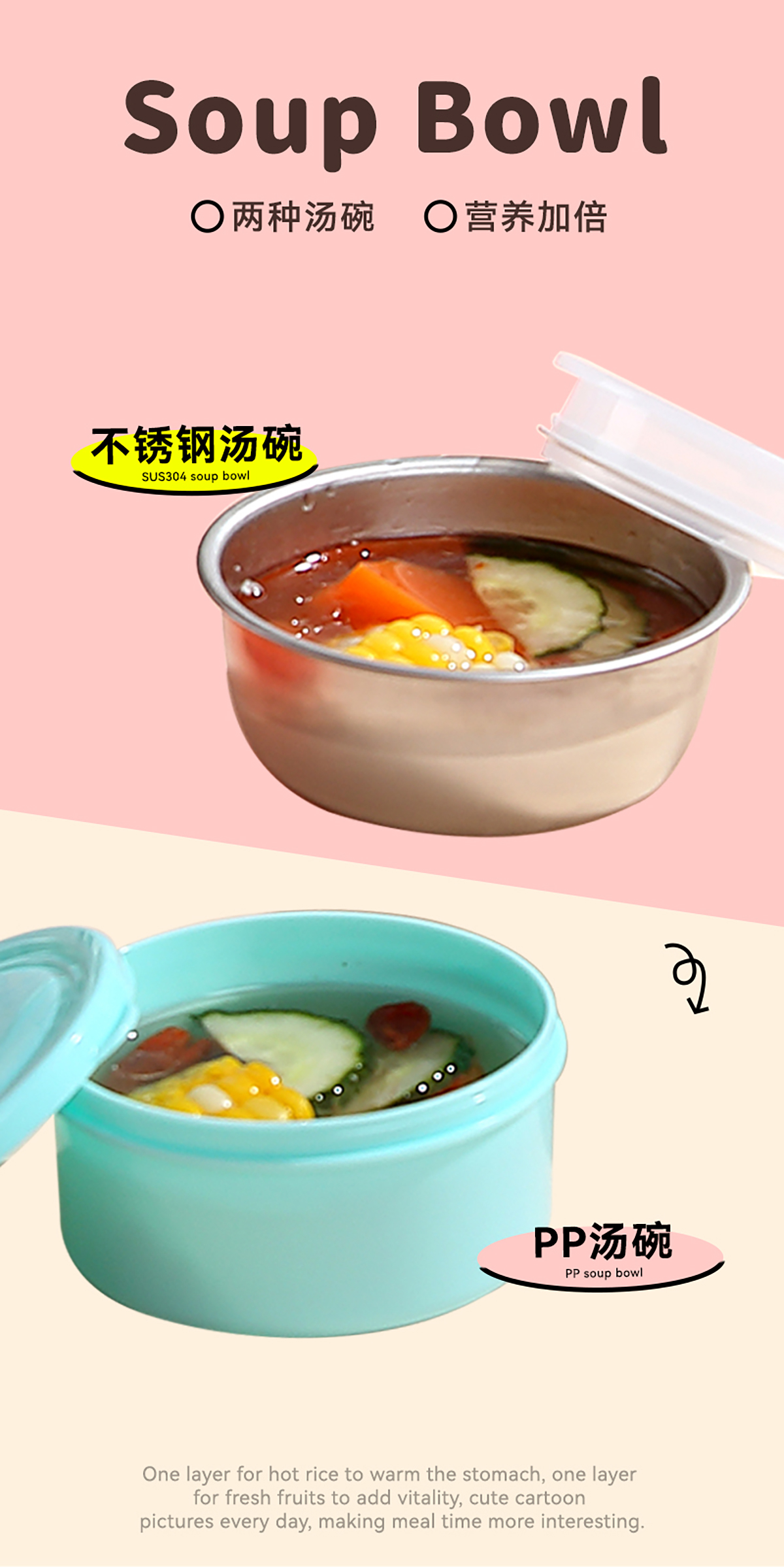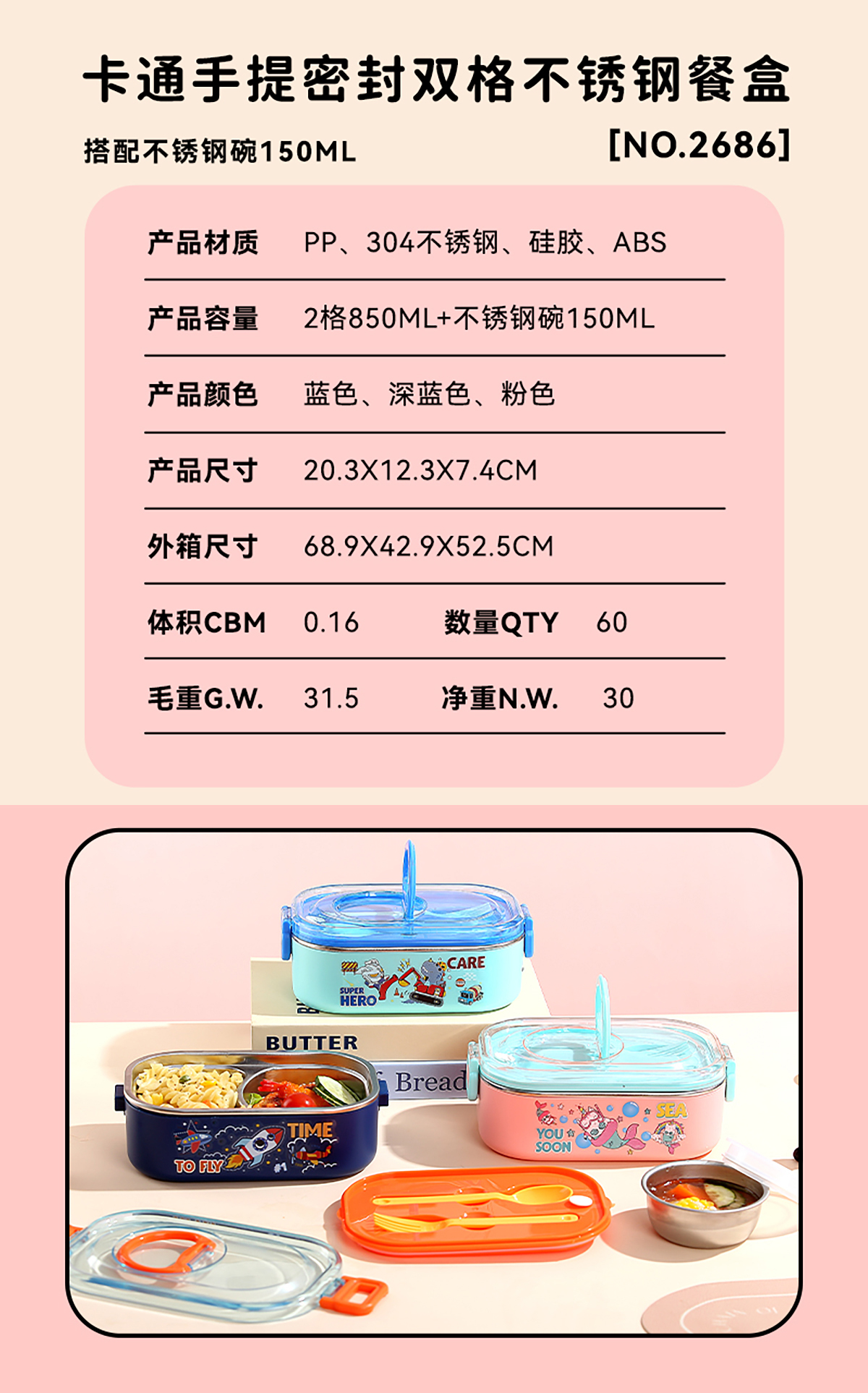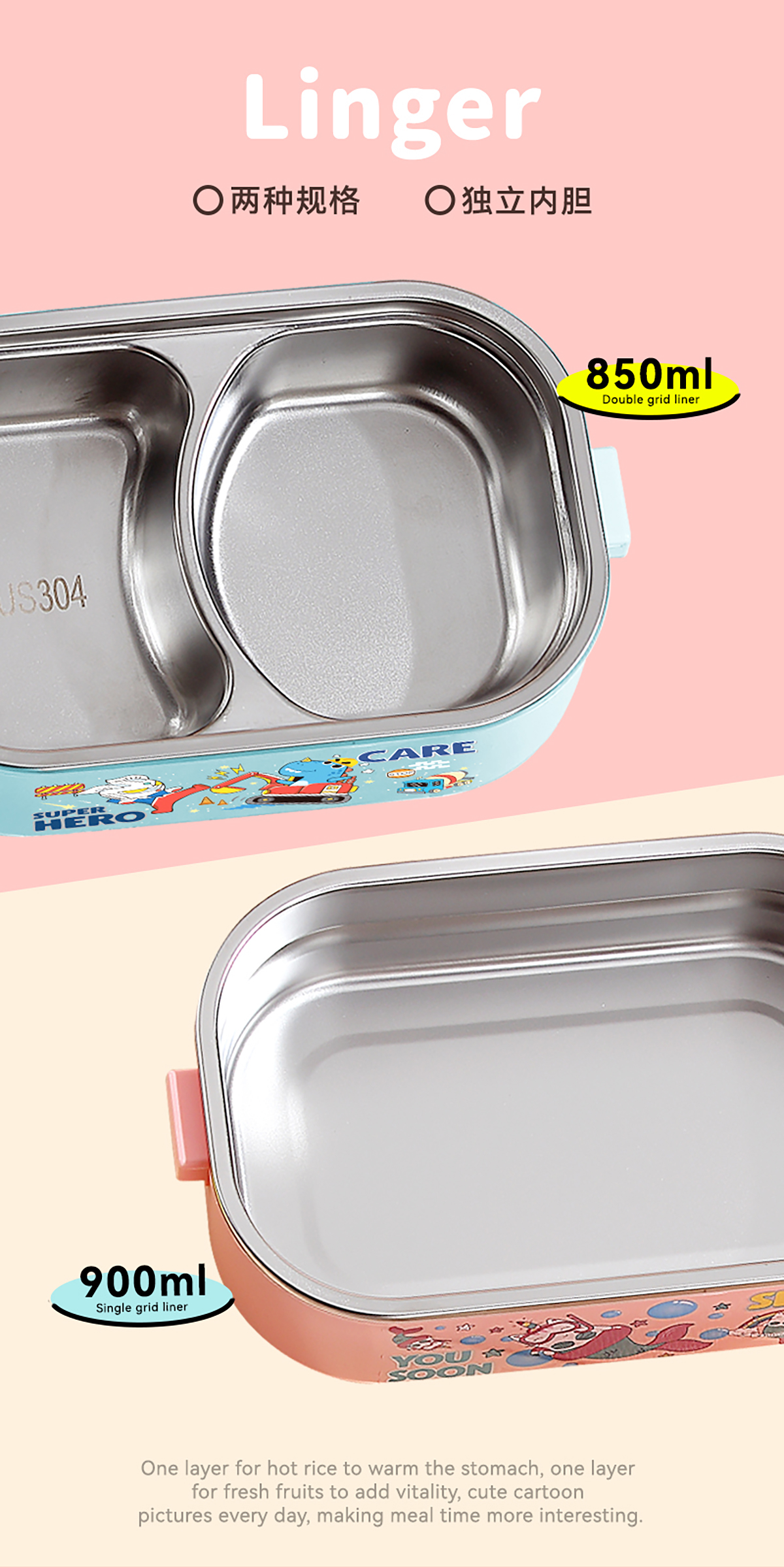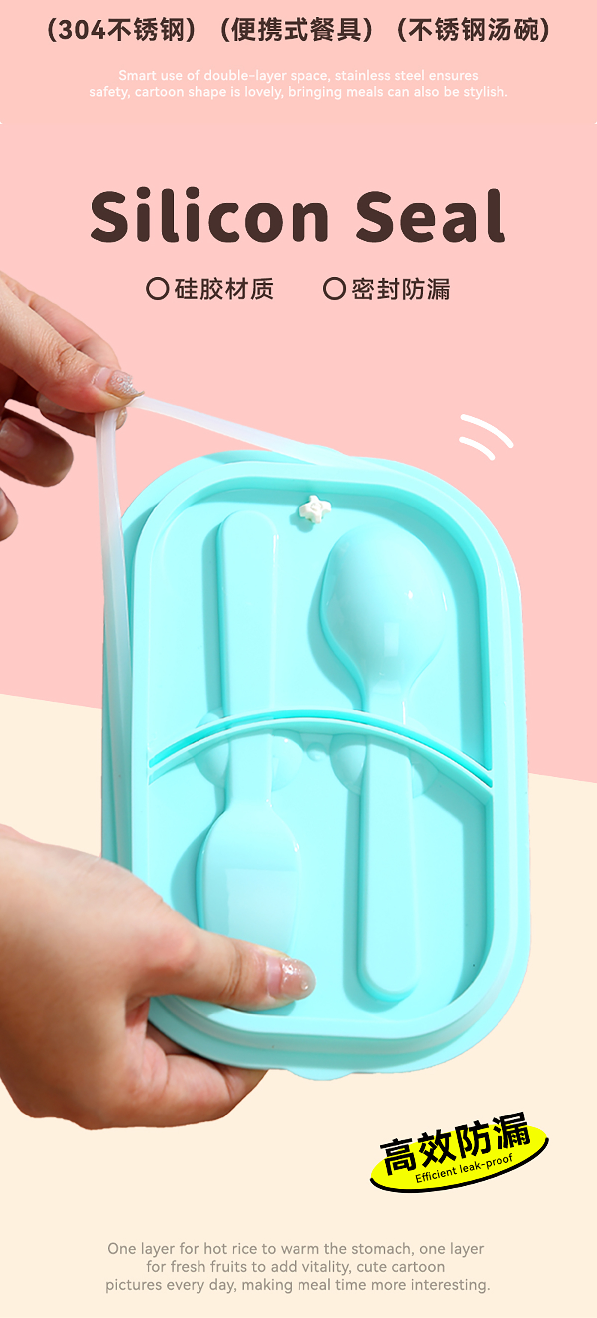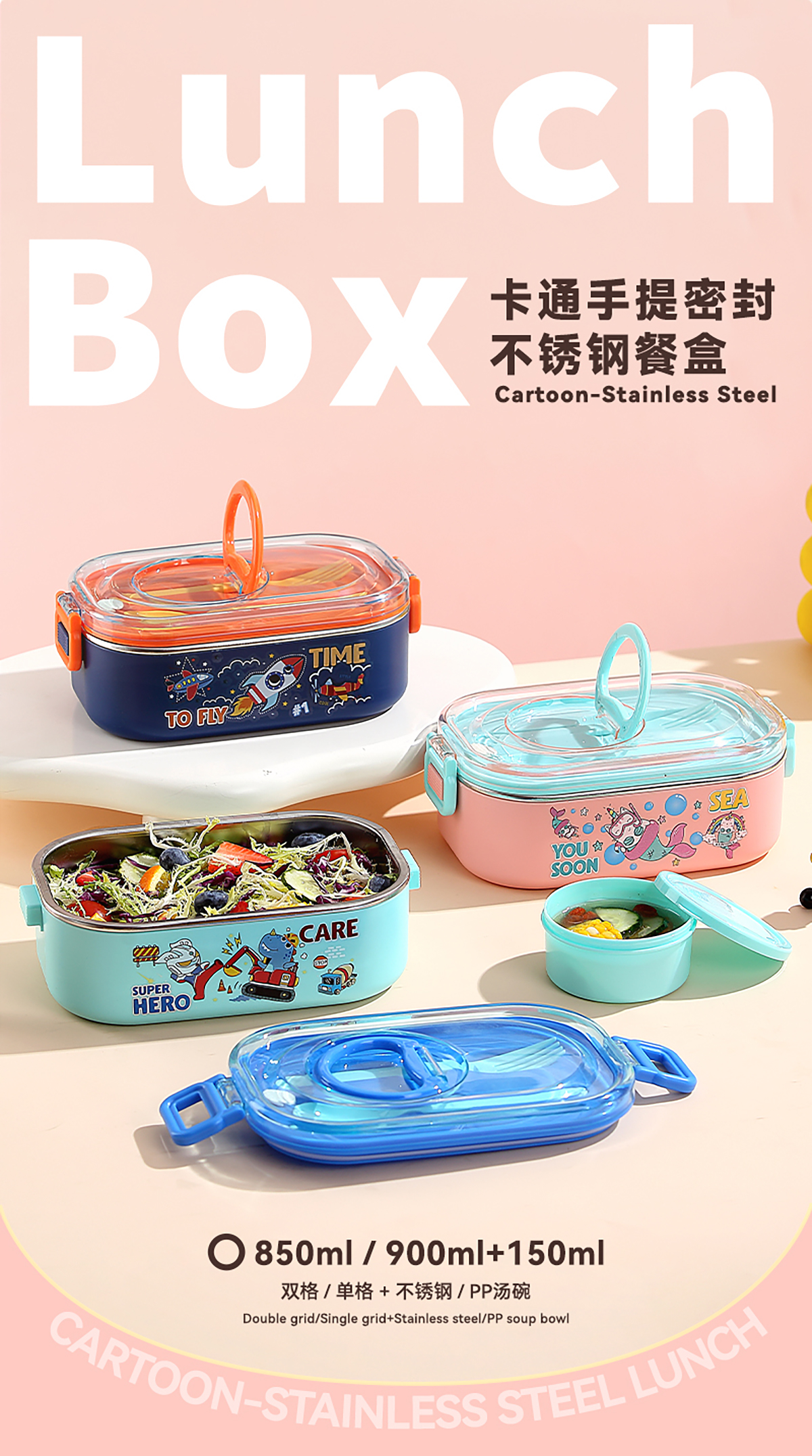 卡通手提密封不銹鋼餐盒(單格900ml/2格850ml+PP碗ml/2格850ml+不銹鋼碗150ml)