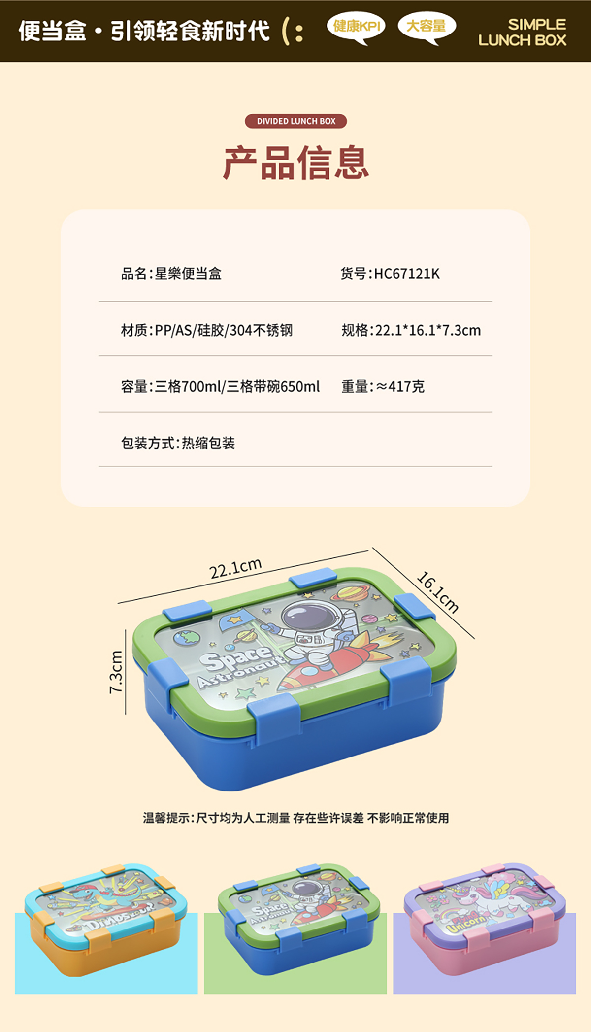Size: 221*161*73mm(三格700ml/三格碗型650ml)