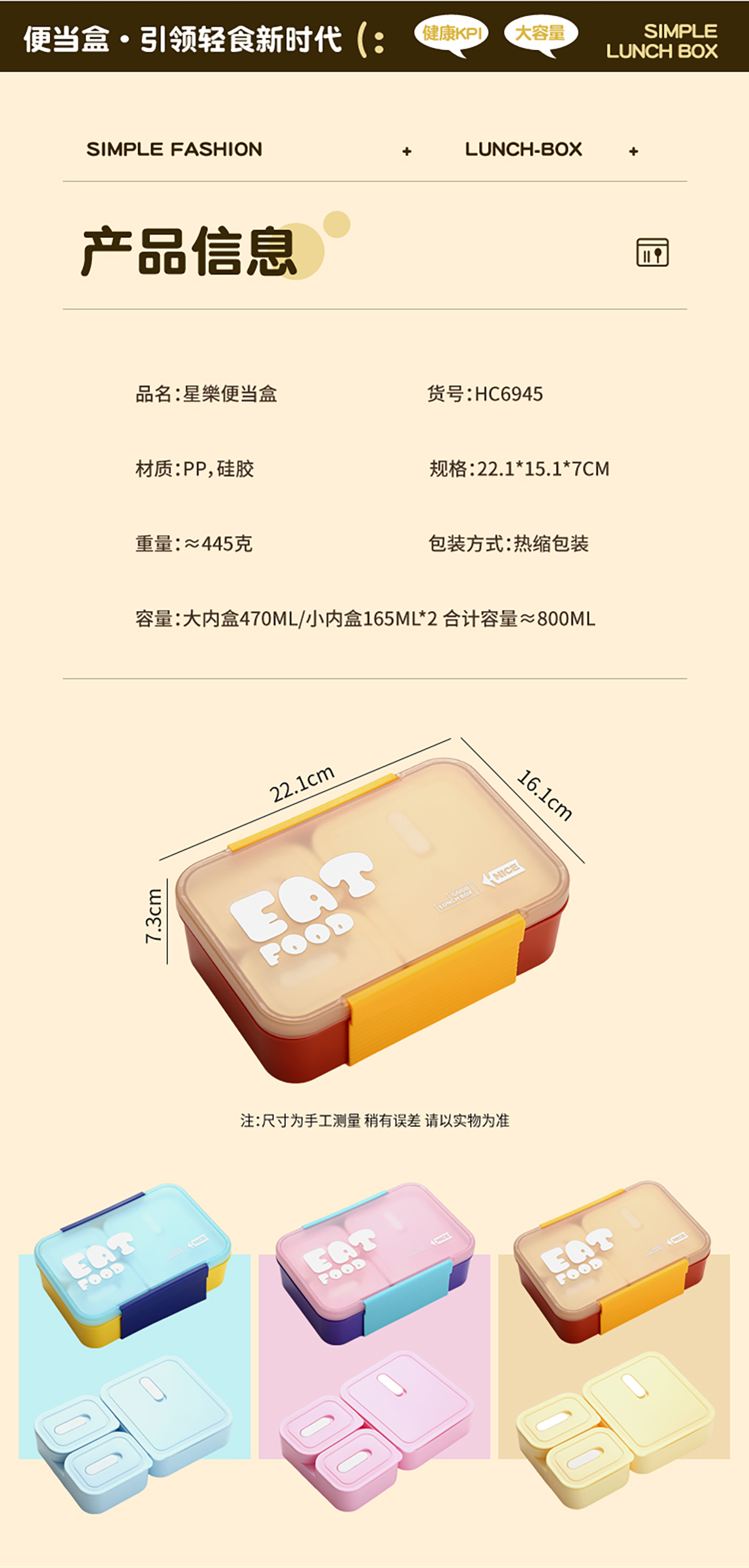 Size: 221*151*70mm/大內(nèi)盒470ml/小內(nèi)盒165ml*2